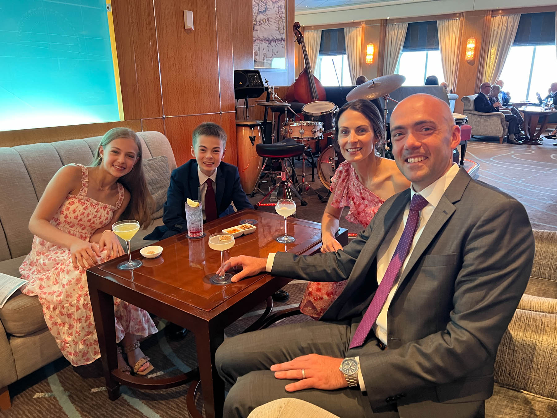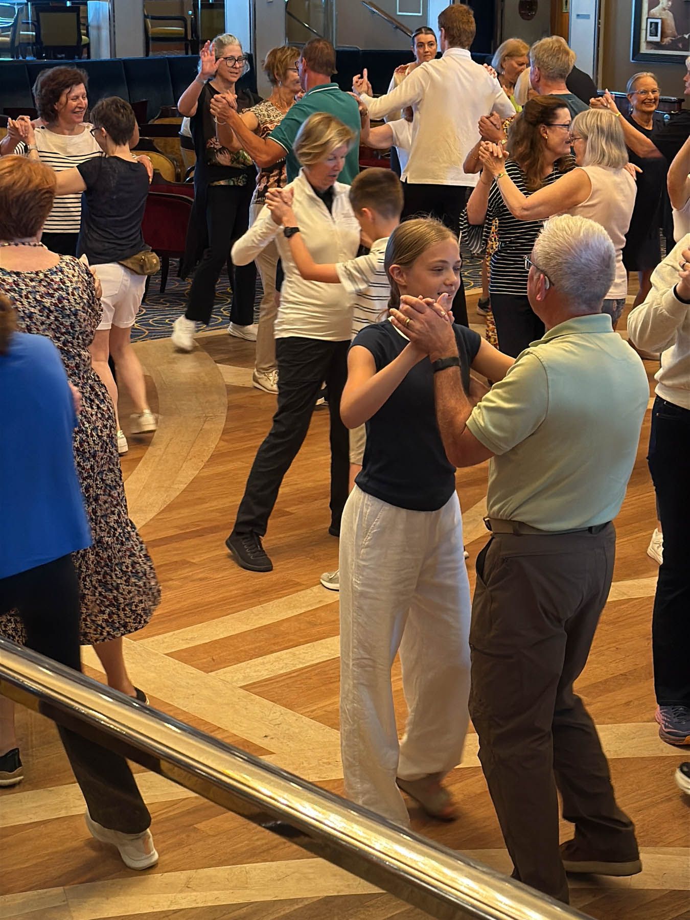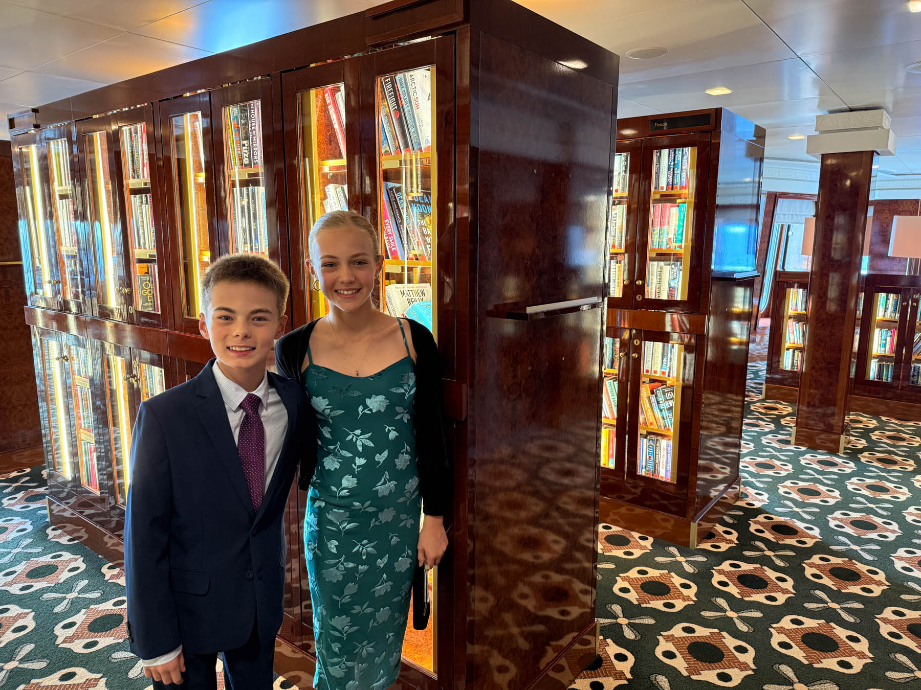 After making it through the boarding process, it was off to explore the ship. While it was the kids’ first cruise, suffice to say that none of the four of us had been on a vessel like this before. To help with the exploring, Elaine created the most epic QM2 scavenger hunt ever! It was a two part hunt. The first was a pre-departure version where answers from the internet were fair game. The second, longer version was to have no help from the internet (not a problem as there weren’t too many cell towers in the North Atlantic) but we could ask the ship’s crew or pull from books in the world’s largest at-sea-library… conveniently located on… you guessed it… the Queen Mary 2. It was girls against boys. If Will and I were to be bested, no better two to best us than Mom and Soph (which they did!). When we weren’t chasing down clues on one of the 14 decks, we were enjoying the food, drinks, and family time – complete with the first round of many ballroom dance classes for Team Lainey/Will and Team Grandpa/Soph.