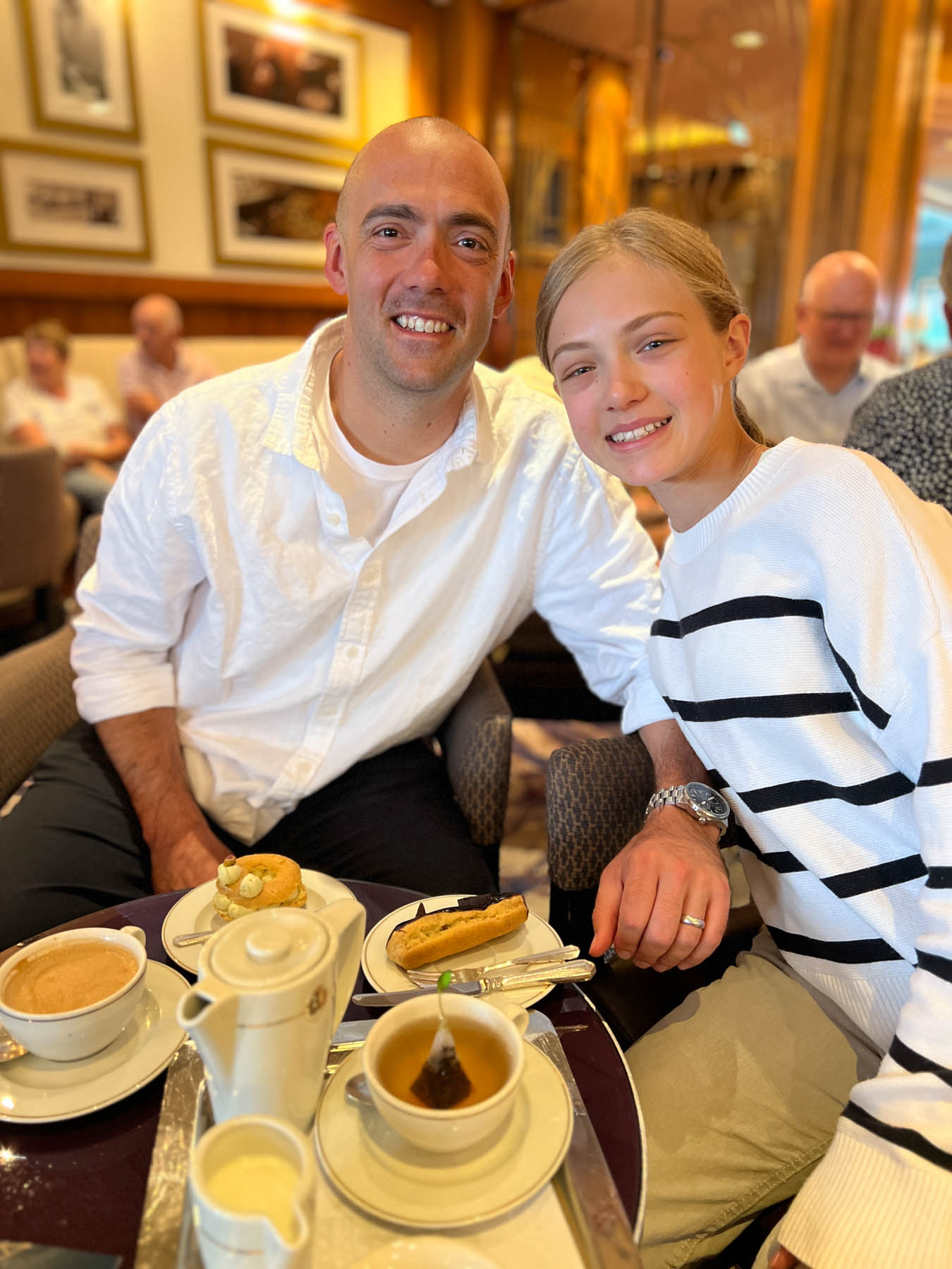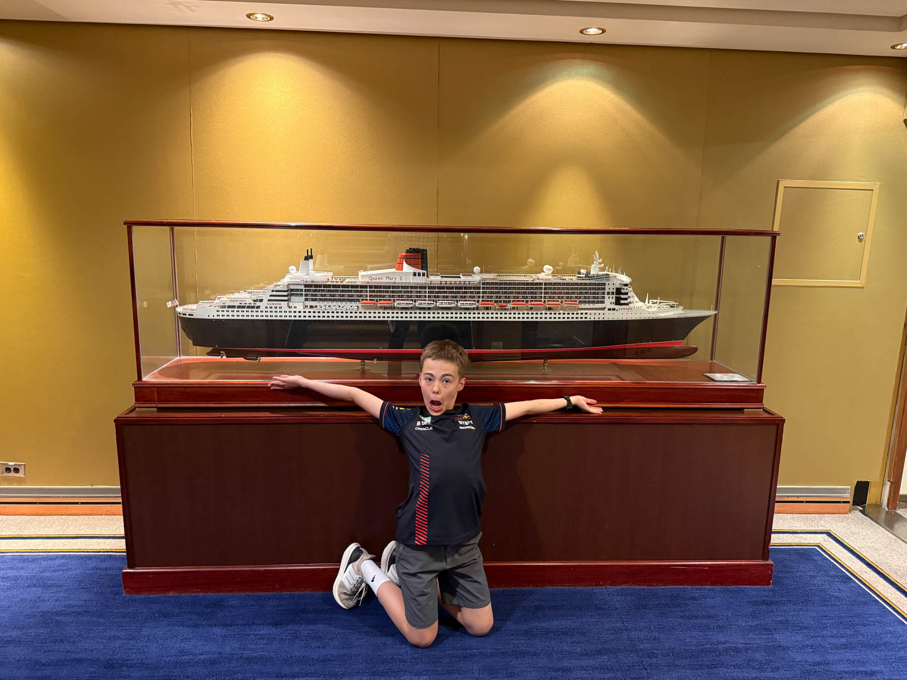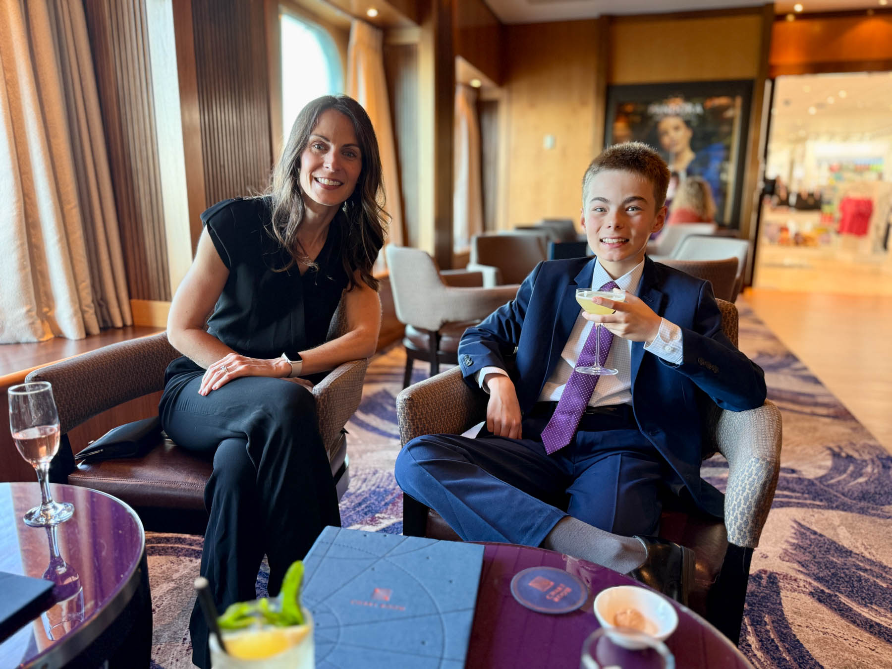 After making it through the boarding process, it was off to explore the ship. While it was the kids’ first cruise, suffice to say that none of the four of us had been on a vessel like this before. To help with the exploring, Elaine created the most epic QM2 scavenger hunt ever! It was a two part hunt. The first was a pre-departure version where answers from the internet were fair game. The second, longer version was to have no help from the internet (not a problem as there weren’t too many cell towers in the North Atlantic) but we could ask the ship’s crew or pull from books in the world’s largest at-sea-library… conveniently located on… you guessed it… the Queen Mary 2. It was girls against boys. If Will and I were to be bested, no better two to best us than Mom and Soph (which they did!). When we weren’t chasing down clues on one of the 14 decks, we were enjoying the food, drinks, and family time – complete with the first round of many ballroom dance classes for Team Lainey/Will and Team Grandpa/Soph.