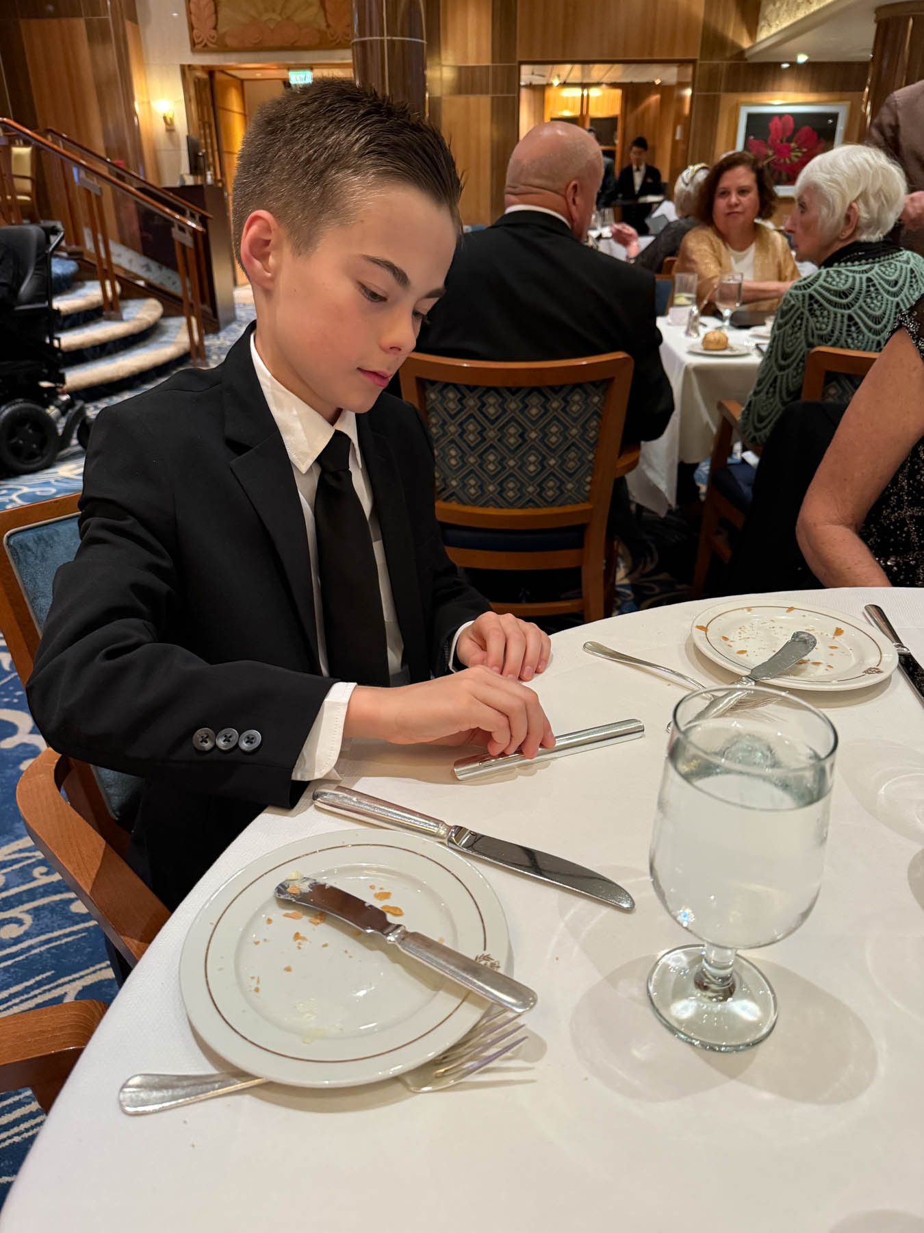 As the liner steamed west, the voyage’s end neared. Last Gala night. Last afternoon tea. Last time Will could use his new favorite crumb scooper given to him by one of the kind waitstaff (he seems less enthusiastic about using it here at the house in VA for some reason).