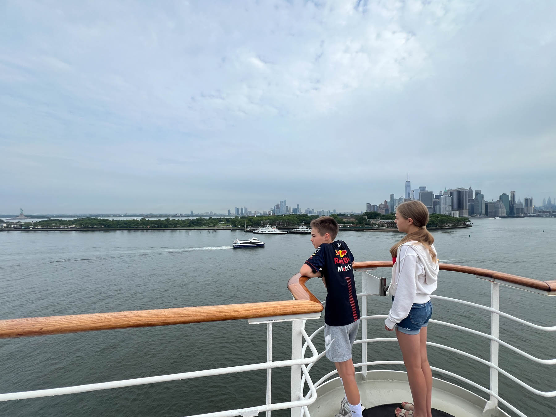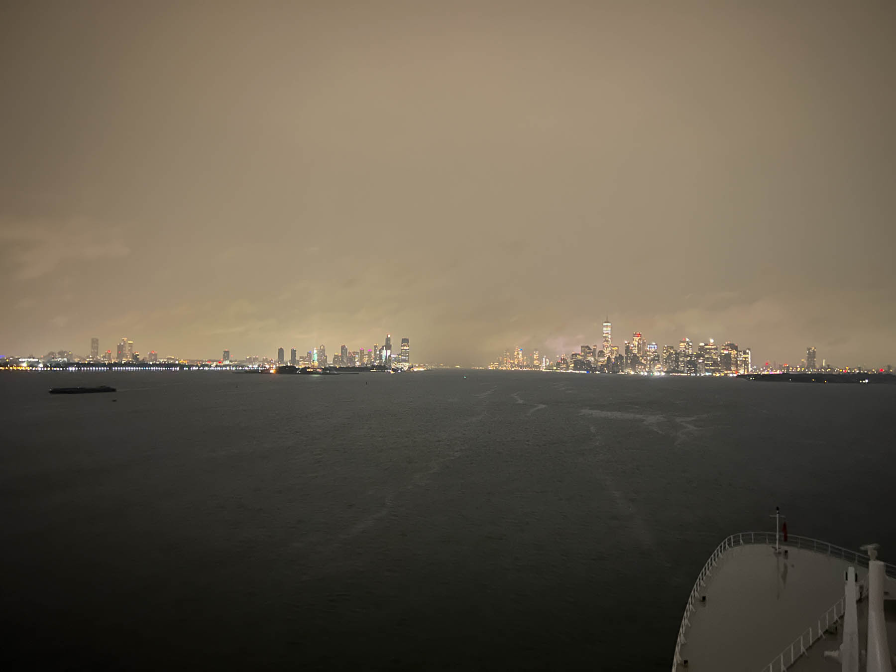 I will say, while I wasn’t enthusiastic about the early morning, I’m thankful Meredith was insistent about watching the arrival into New York. Under the Verrezzano Bridge at 3am and through the dark misty sky rises up the Manhattan skyline, complete with a great view of the Green Lady herself. Kinda wild to imagine the feeling that folks had 100 years ago seeing the Statue of Liberty as they completed their own (much longer, much less comfortable) trans-Atlantic voyage to America.